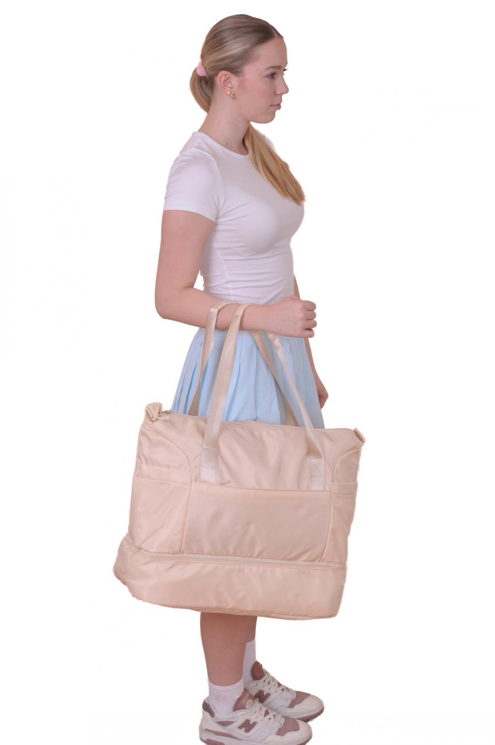 Taška je prakticky rozdělena na dvě samostatné části, což umožňuje přehlednou organizaci obsahu a oddělení čistých a použitých věcí.