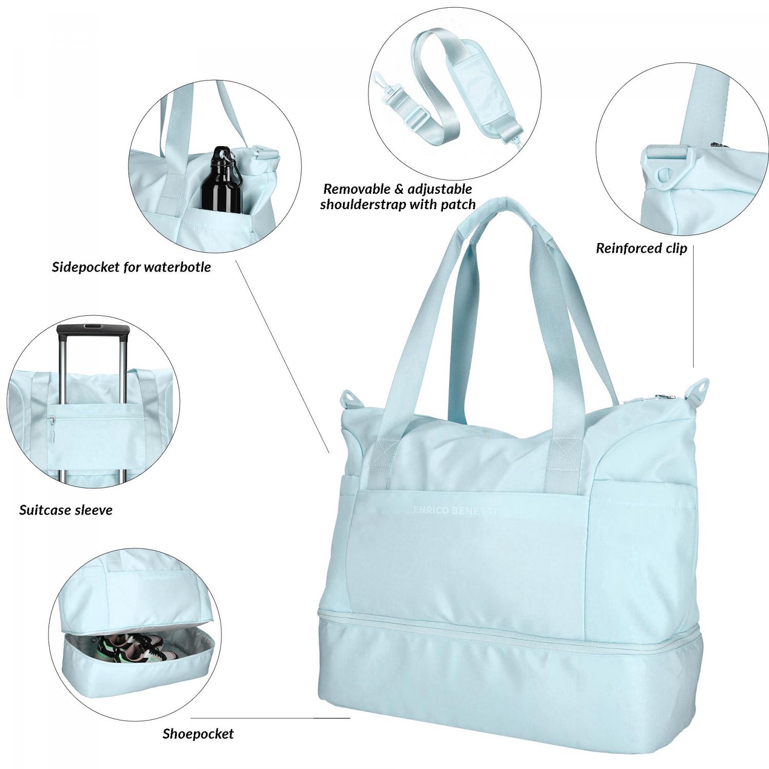 Dámská sportovní taška Enrico Benetti z kolekce Lakers spojuje moderní eleganci s maximální funkčností. Díky velkorysému objemu a chytrému členění poskytuje dostatek prostoru nejen pro sportovní vybavení, ale i pro víkendové cestování či každodenní využití. Jemné světle modré provedení dodává tašce univerzální a elegantní vzhled, který se snadno kombinuje s jakýmkoliv outfitem.