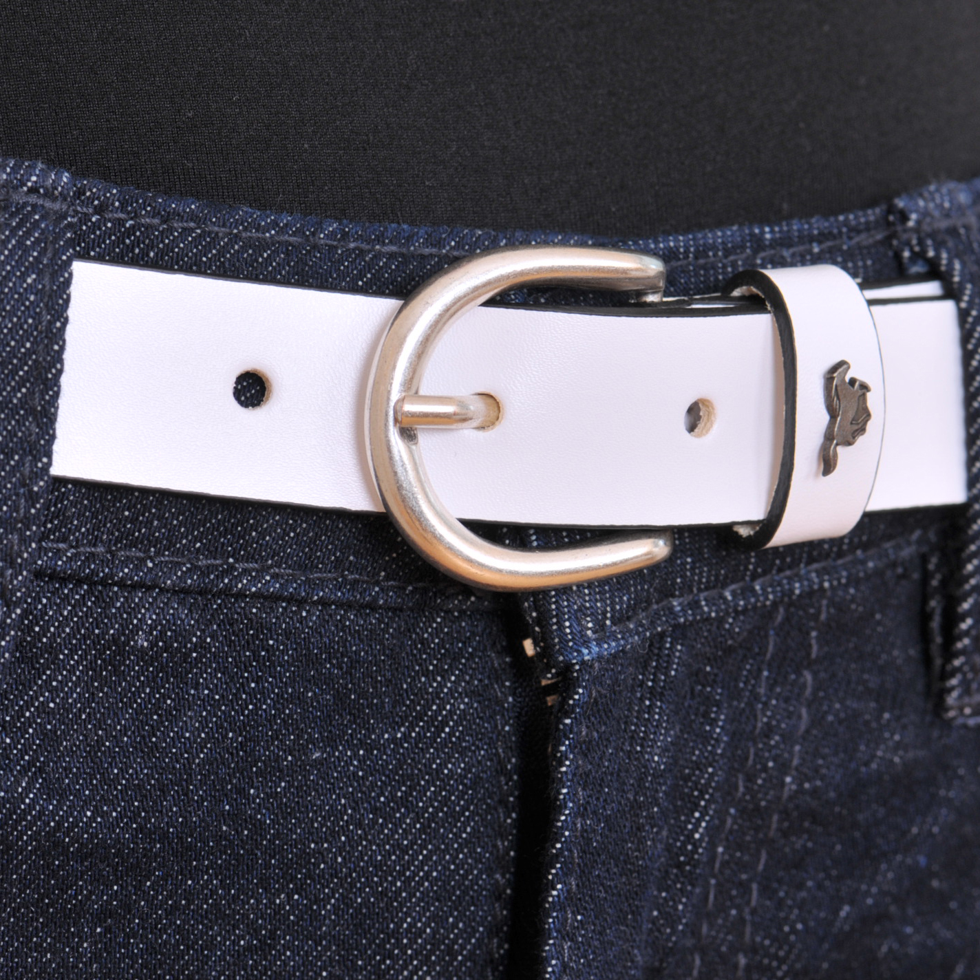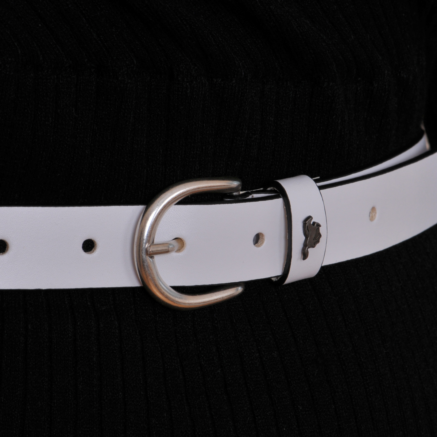 Bílý dámský kožený pásek o šířce 2,5 cm má pěknou malou sponu s povrchovou úpravou NKS (nikl satinato). Tato spona obsahuje nikl. Pásek je vyrobený z kvalitní kůže. Na výběr máte z různých délek opasků. Spona je k opasku přišitá napevno.