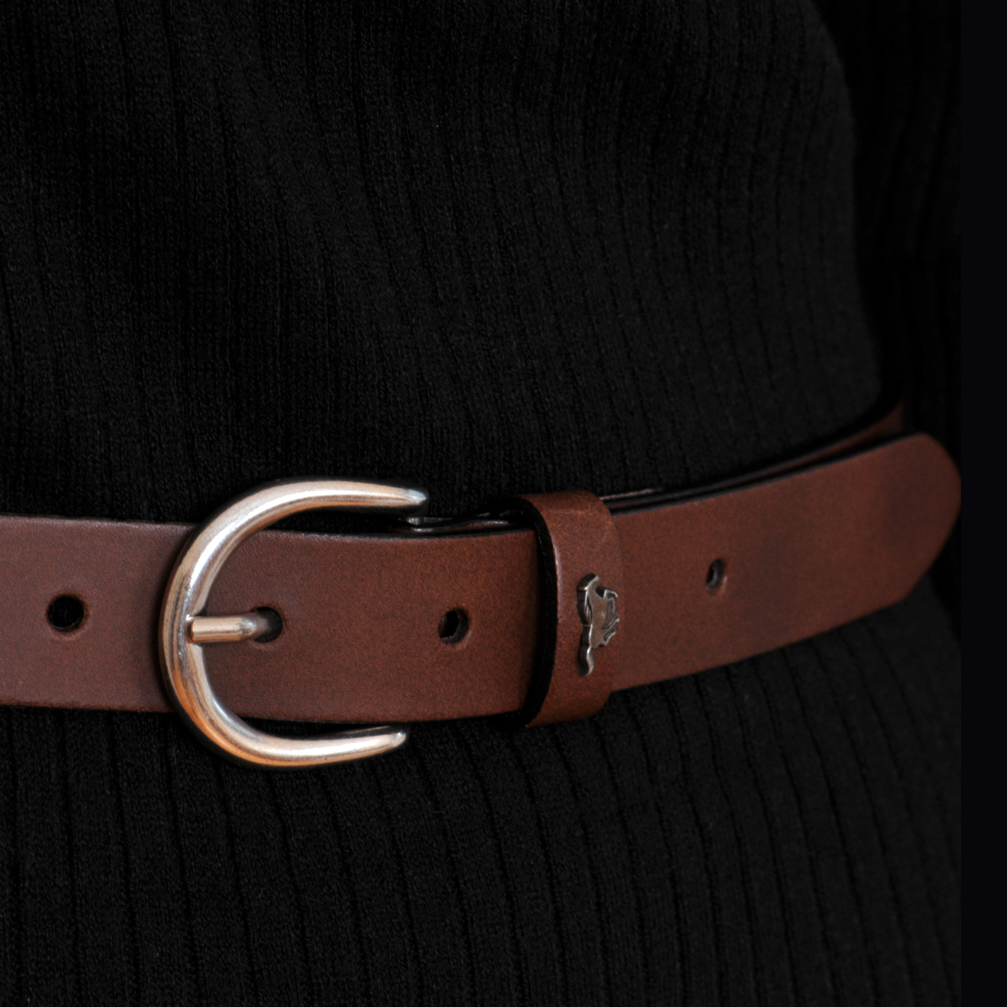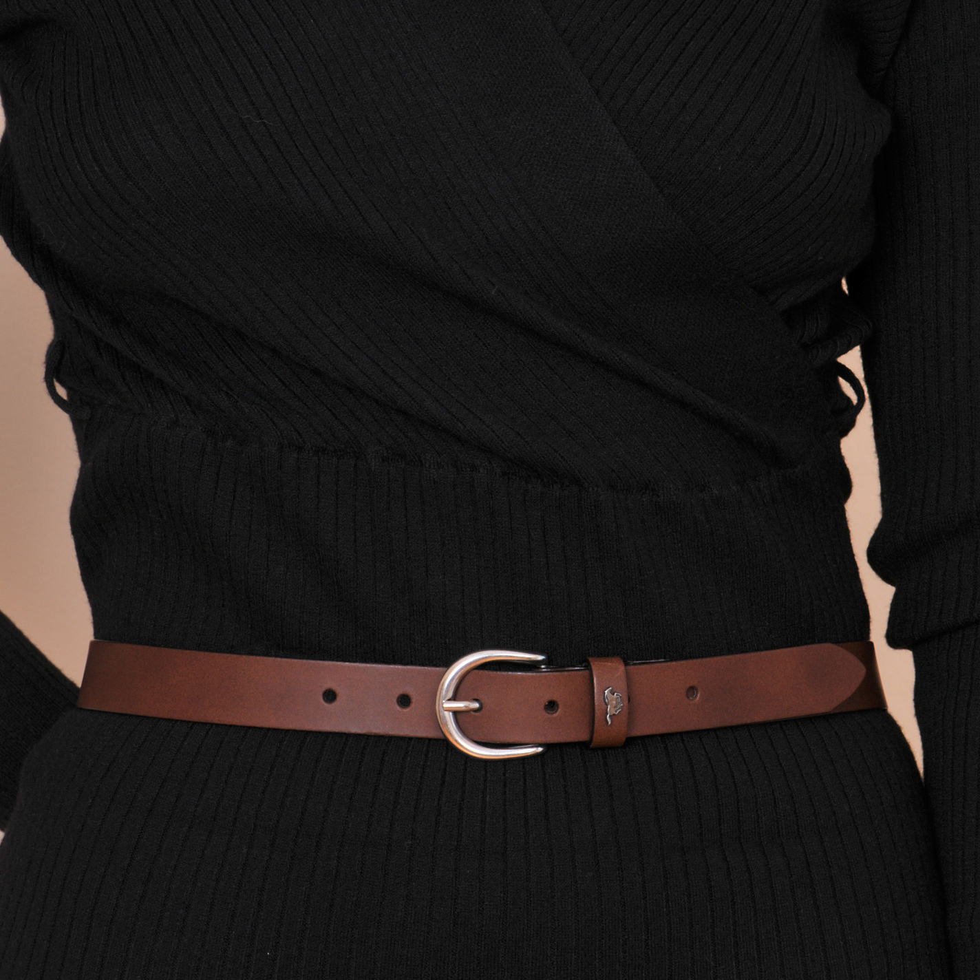 Hnědý dámský kožený pásek o šířce 2,5 cm má pěknou malou sponu s povrchovou úpravou NKS (nikl satinato). Tato spona obsahuje nikl. Pásek je vyrobený z kvalitní kůže. Na výběr máte z různých délek opasků. Spona je k opasku přišitá napevno.  Hrany opasku jsou ošetřeny černou barvou, která zajišťuje hladké zakončení a delší životnost.