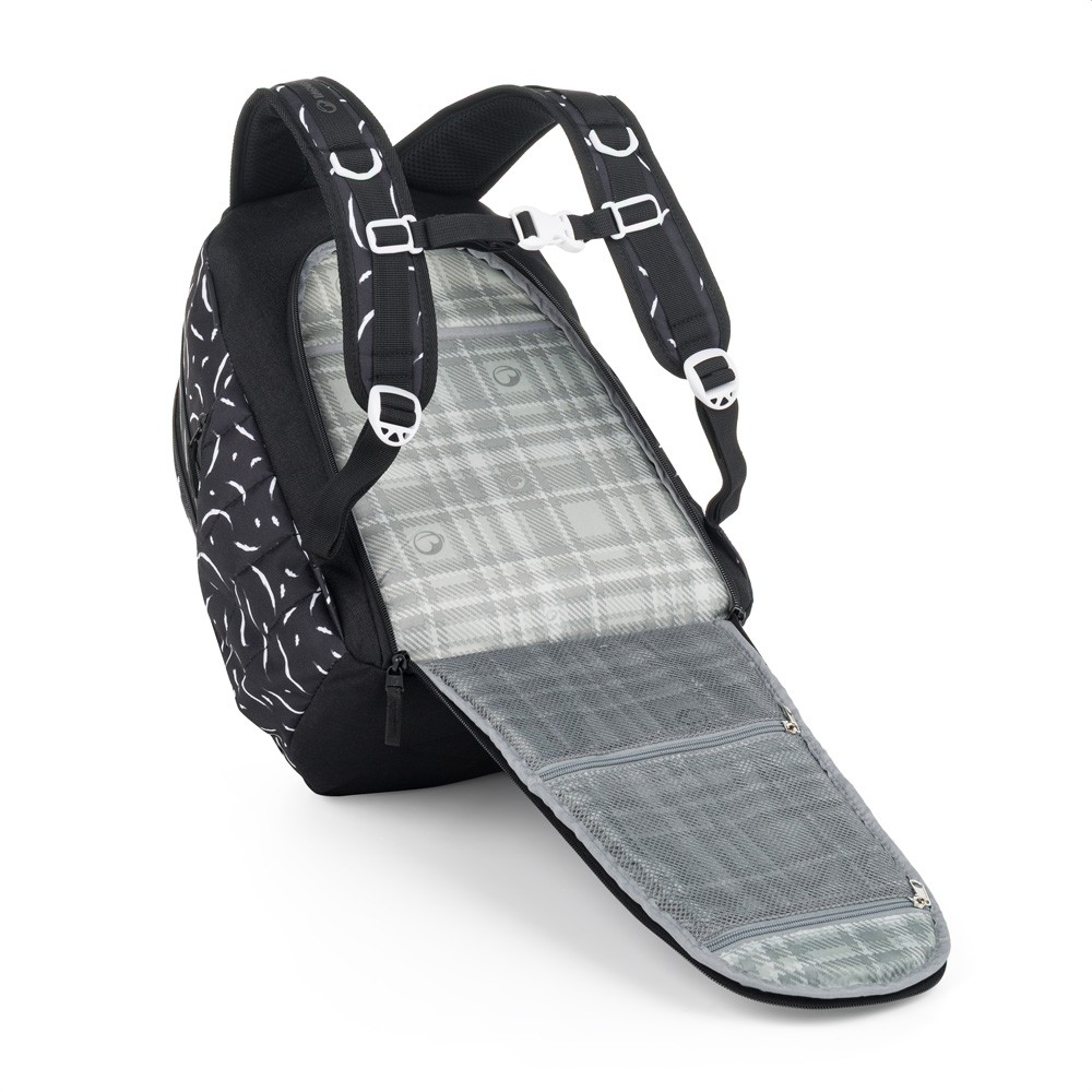 - Díky polstrovaným zádům, nastavitelným a měkkým ramenním popruhům a hrudnímu pásu batoh podporuje správné držení těla.
