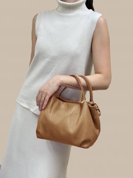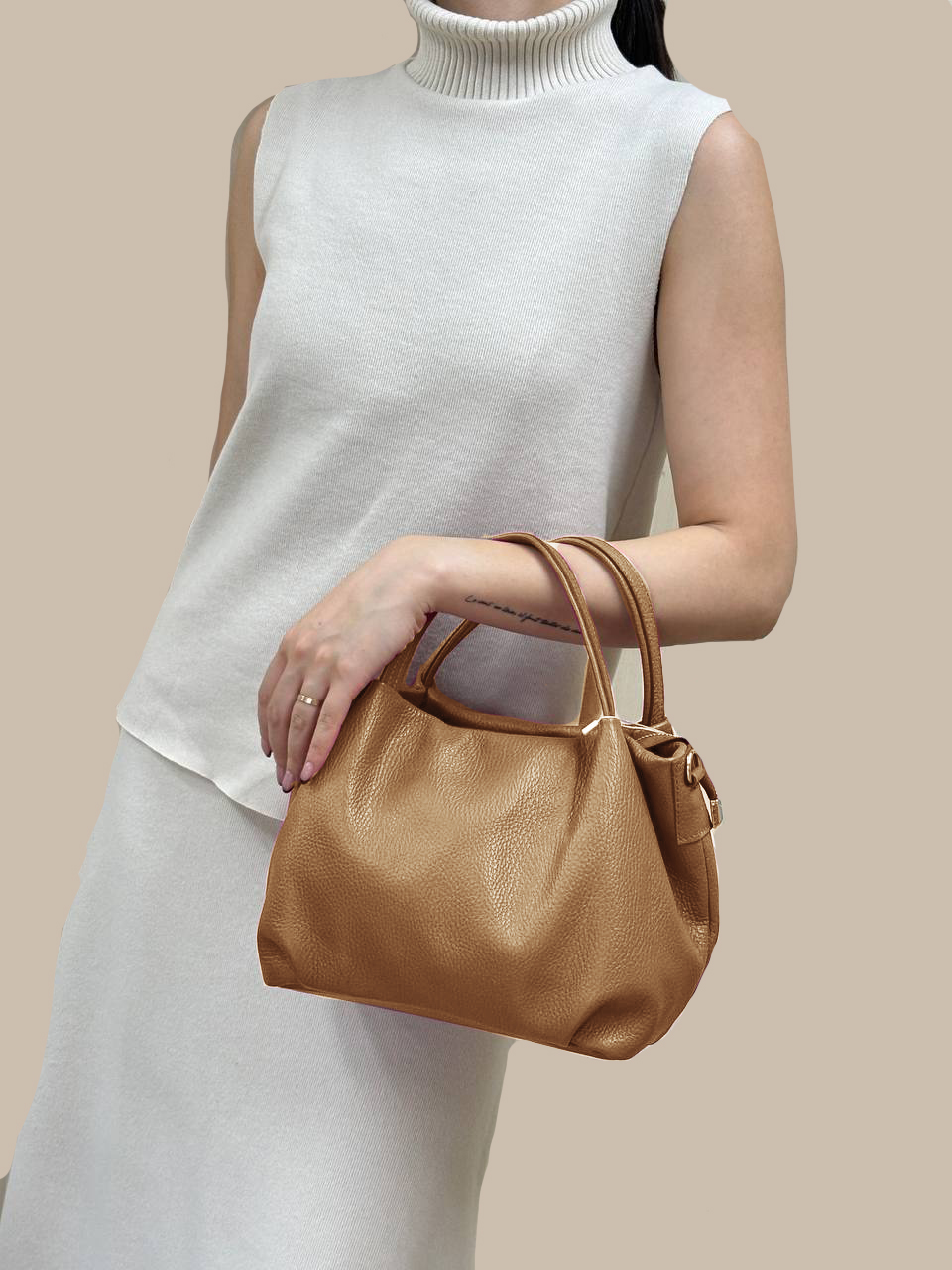Dámská kožená kabelka střední velikosti pro každodenní nošení. Tato kabelka je vyrobená z krásné kůže v hnědé barvě, která je elegantní a můžete ji zkombinovat s černou nebo bílou barvou.  Její další výhodou je, že ji můžete nosit v ruce, nebo pokud budete potřebovat mít volné ruce, můžete si připnout popruh na rameno.