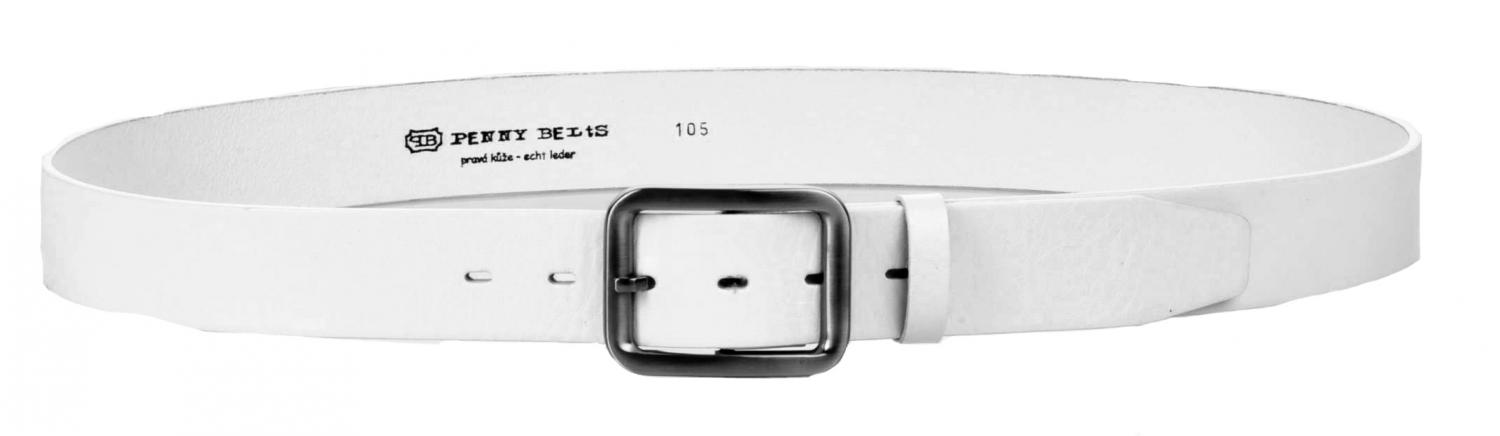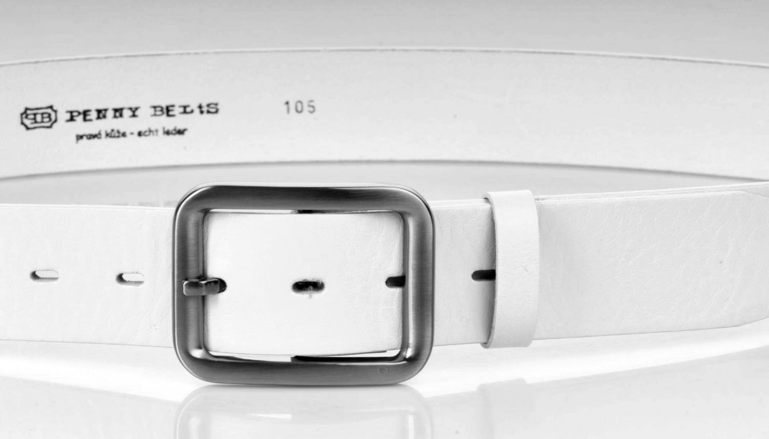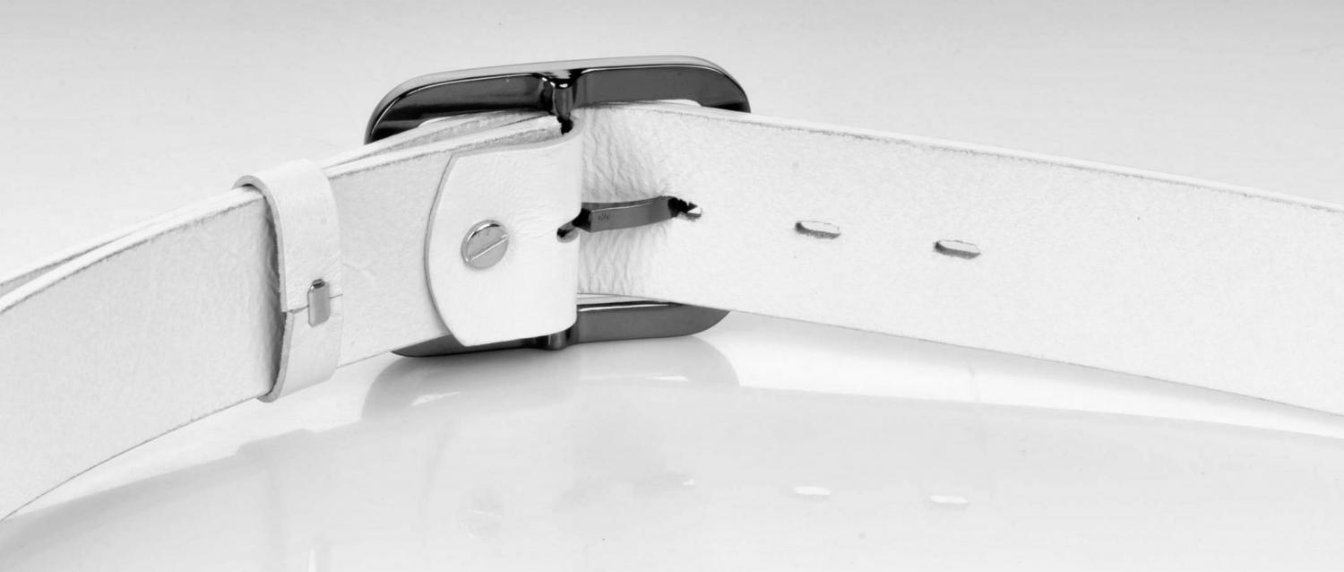 Dámský kožený opasek o šířce 40 mm má zajímavou sponu s povrchovou úpravou NKS (nikl satinato). Tato spona obsahuje nikl. Pásek je vyrobený z bílé matné usně se zcela přírodním charakterem. Opasek má zabarvené hrany a upravený rub pásku, což zaručuje, že nedojde k zabarvení oděvu. Pásek není prošitý a lze ho zkrátit pomocí šroubku, který spojuje opasek a kožený díl se sponou.