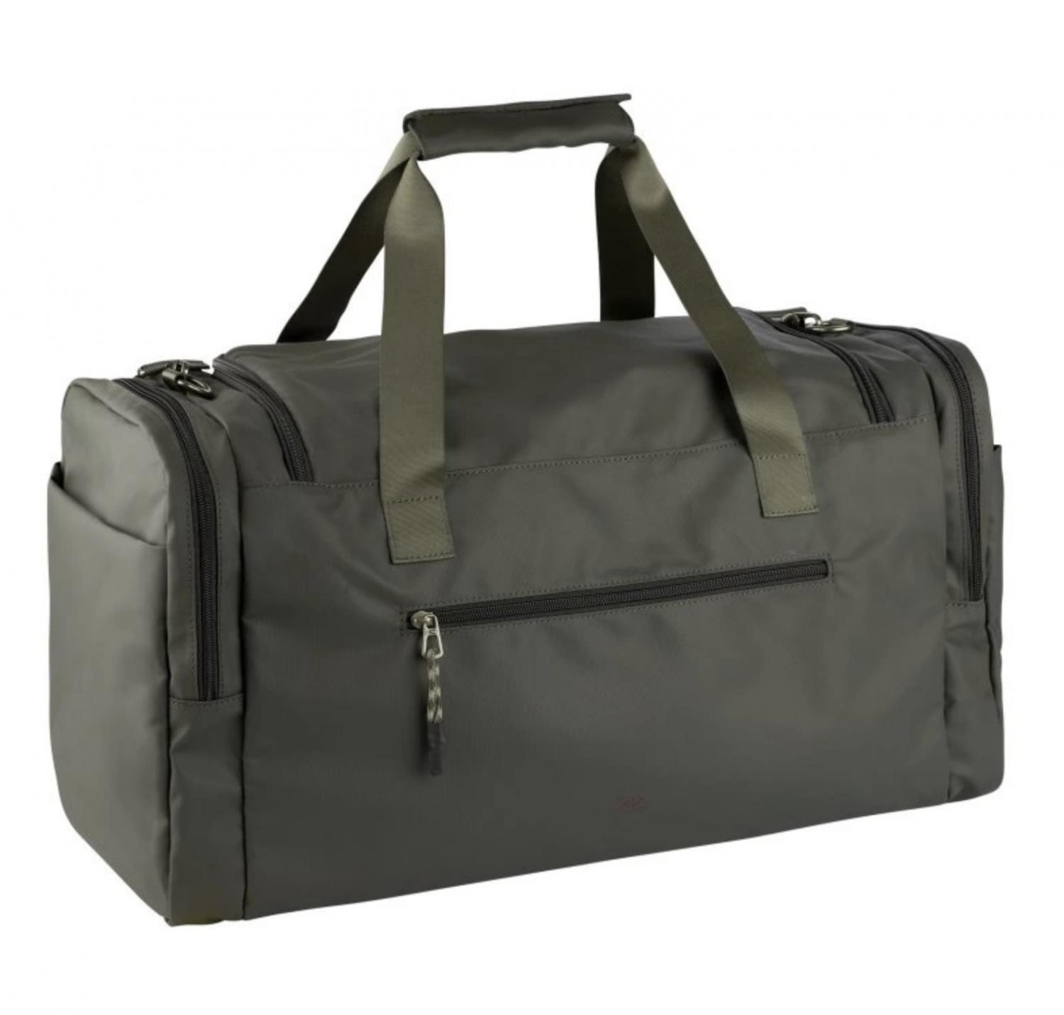 Tato khaki weekendová taška z odolného recyklovaného nylonu zaujme výraznými reflexními pruhy, které zajišťují lepší viditelnost ve večerním městském provozu. Materiál je pevný, vodoodpudivý a přitom lehký – ideální pro spontánní víkendové výlety nebo každodenní cesty do fitness centra.