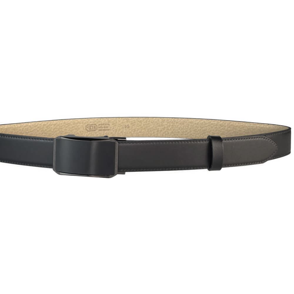 Černý pánský kožený opasek o šířce 35 mm má zajímavě řešenou plnou sponu s povrchovou úpravou NKS (nikl satinato). Tento opasek nemá dírky - spona AUTOMAT se zapíná speciálním mechanismem. Pásek je vyrobený z kvalitní italské úsně v černé barvě, podlepené světle béžovou kůží. Opasek je vhodný na nošení při společenských událostech. Pásek má lakované hrany i rub opasku, což zaručuje, že nedojde k zabarvení oděvu. Opasek lze ho zkrátit pomocí šroubku, který spojuje pásek a kožený díl se sponou. Prvotřídní kvalita od českého výrobce.