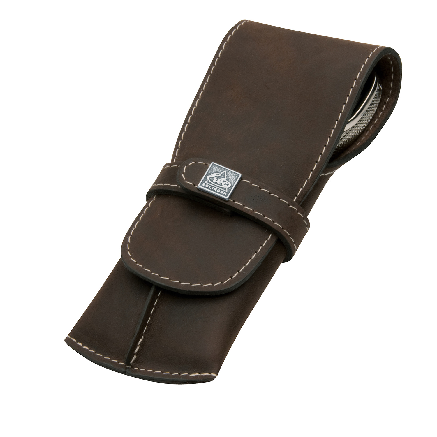 Pouzdro je vyrobeno z pravé hovězí kůže v elegantní hnědé barvě. Hladký povrch působí luxusně a je příjemný na dotek. Praktické uzavírání na klopnu chrání nástroje při přenášení. Vnitřní část je podšitá jemnou sametovou látkou, která zvyšuje ochranu i celkový dojem.